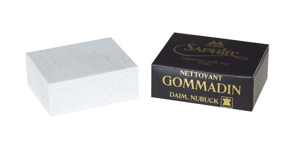 The Gommadin is a coarse-grained rubber block that works to lift the leather's nap while cleaning it, restoring the grain and revitalizing shiny areas without altering the color.