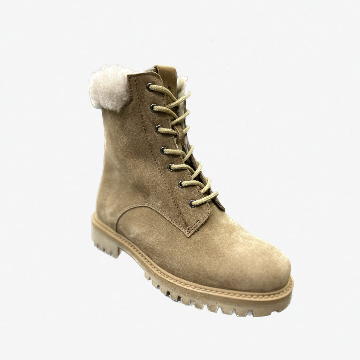 Bottillons d'hiver plaqués en suède véritable et imperméable. Bout rond. Collet en mouton véritable. Doublure en laine naturelle.