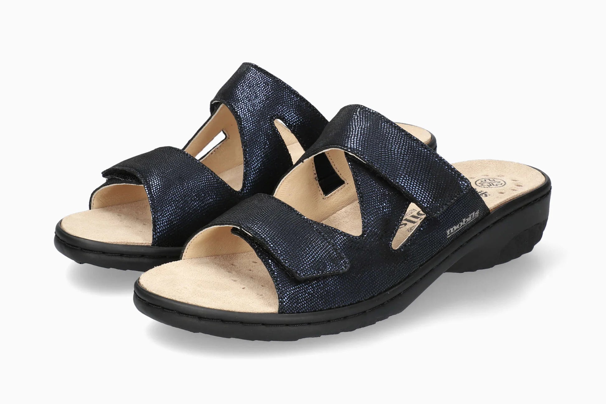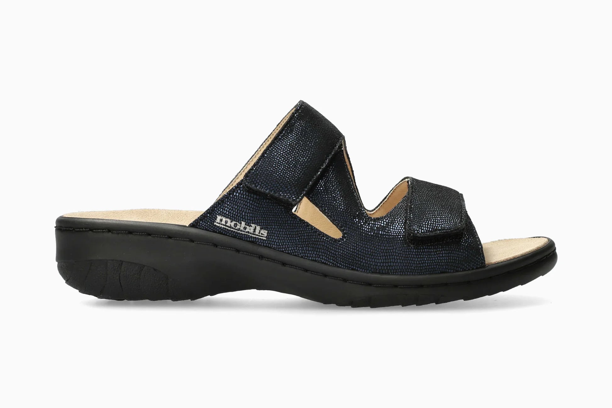 Pratique et confortable, cette mule vous accompagnera aussi bien dans vos sorties quotidiennes que lors d'occasions plus habillées. La semelle intérieure amovible, dotée de la technologie SOFT-AIR, et le SHOCK-ABSORBER, intégré à la semelle, contribuent à minimiser les chocs pour une marche sans effort et tout en souplesse. L'INTEGRAL CUSHIONING, une couche de rembourrage exceptionnelle entre la doublure et le cuir naturel, assure un confort optimal en enveloppant vos pieds et en empêchant toute compression à l'intérieur de la chaussure. Les brides adhésives réglables garantissent un ajustement parfait. La doublure en cuir assure une bonne hygiène du pied. Cette mule bleu marine pour femme est réalisée en cuir pailleté à effet métallisé.